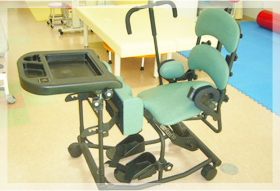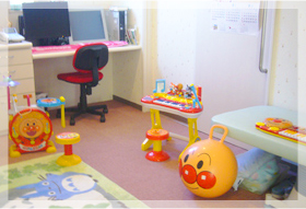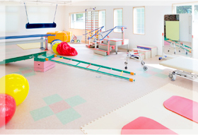 正常発達を促す赤ちゃん体操の指導から、障害児リハまで行います。一般リハのお部屋と完全に分かれていますので、他の患者さんに気兼ねすることなく、のびのびと治療を受けていただけます。