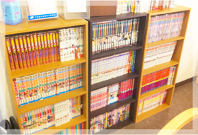 本棚には人気のマンガがぎっしり並んでます。ご自由にお読みください。